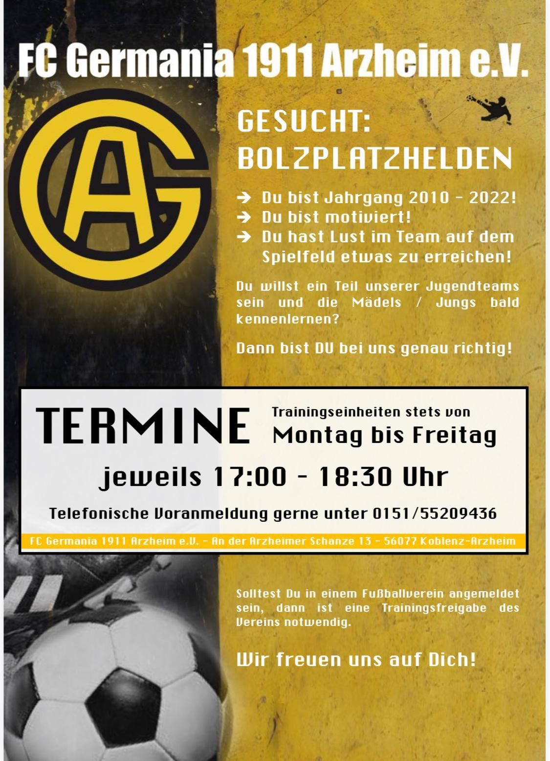 Der FC Germania Arzheim wurde im Jahr 1911 gegründet und spielt in der aktuellen Saison mit seiner ersten Mannschaft (19ELF) in der Kreisliga B, während die 2. Mannschaft (ZWOTE1911) in der Kreisliga C den Bällen nachjagt. 14 Jugendteams spielen im Meisterschaftsbetrieb. Die Heimspiele werden im legendären Pappelstadion zu Arzheim ausgetragen.